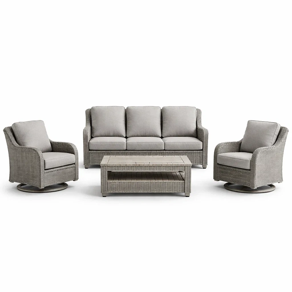 Produits inclus : 1 canapé trois places, 2 fauteuils pivotants, 1 table basse.